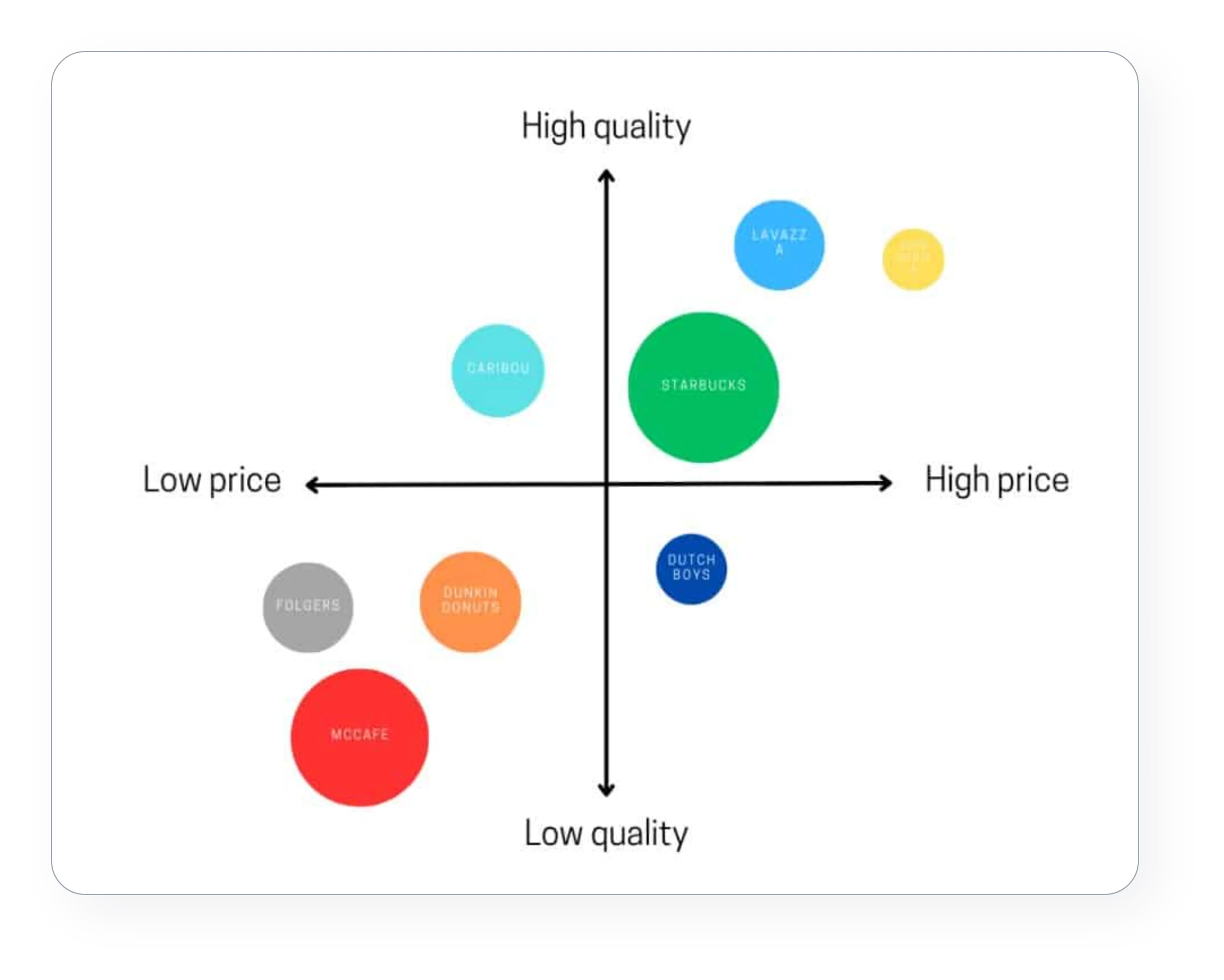 Dit is visueel inzicht. Je kiest twee belangrijke factoren (prijs versus kwaliteit, bijvoorbeeld, of traditioneel versus modern) en plot alle spelers in je markt op een kaart.