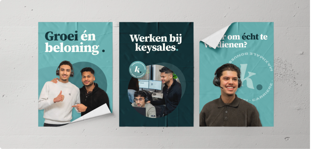 Voor de tweede fase lieten we de standaard stockfoto’s lekker voor wat ze waren. Bij Keysales draait het om mensen, dus hebben we een vette shoot op locatie georganiseerd. Onze designers hebben deze beelden vervolgens zo bewerkt dat ze naadloos aansluiten bij de nieuwe huisstijlkleuren. Het resultaat is een unieke beeldtaal die niet alleen professioneel oogt, maar ook de oprechte sfeer en die onvermoeibare teamgeest van de werkvloer direct overbrengt op de bezoeker van de site.