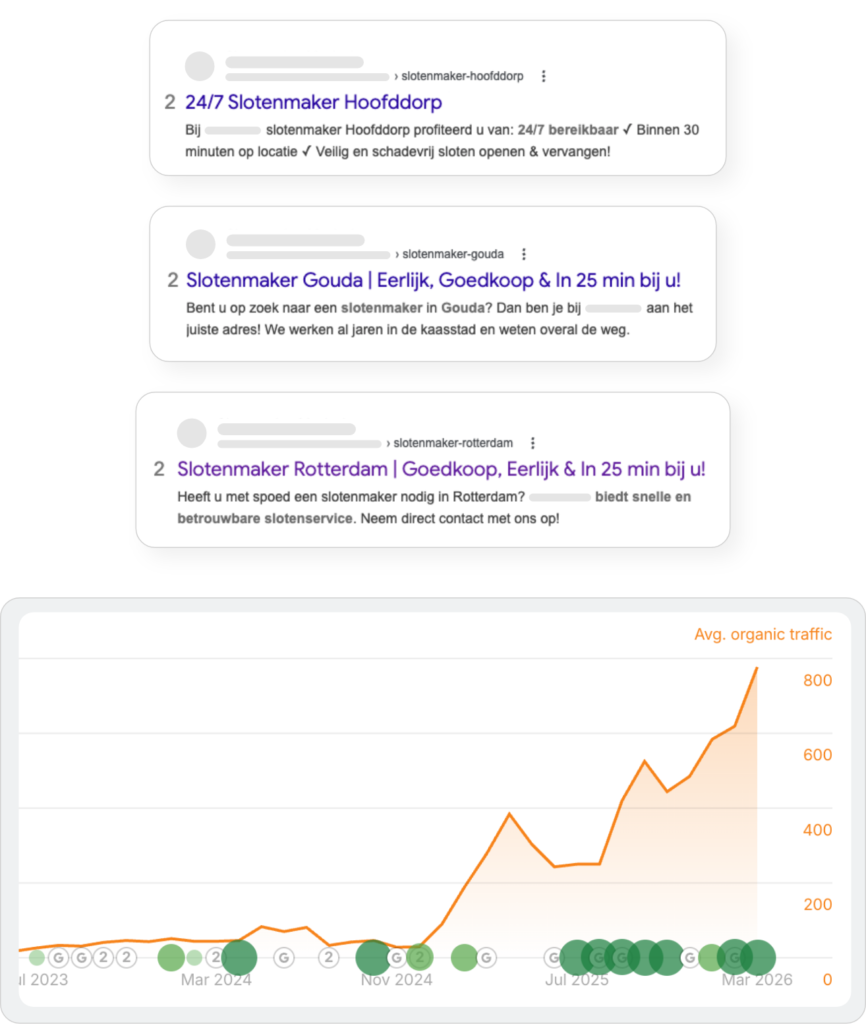 Slotenmakers en Google: het is een wereld op zich. De concurrentie is moordend en de regels zijn streng. Onze klant wilde geen vage landelijke dekking, maar zocht de macht in Rotterdam, Hoofddorp en Gouda. In deze steden telt alleen de top 3; sta je daaronder, dan besta je simpelweg niet voor iemand die met spoed voor een dichte deur staat. We moesten een eerlijk en vindbaar merk bouwen in een markt die helaas vergeven is van de onbetrouwbare tussenpersonen.